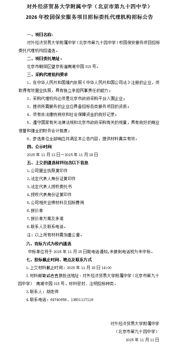 对外经济贸易大学附属中学(北京市第九十四中学) 2026年校园保安服务项目招标委托代理机构招标公告