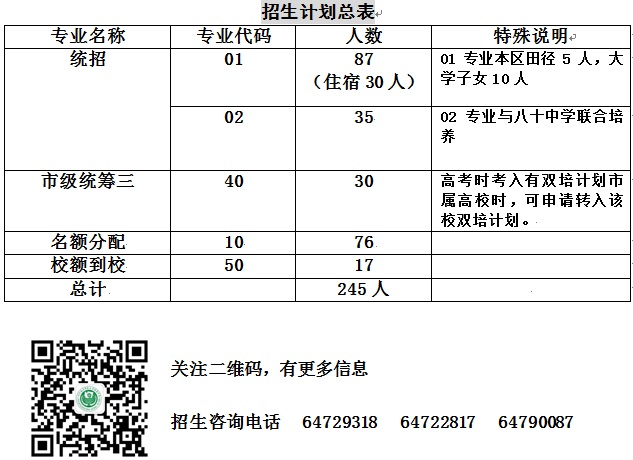 学校在连续三年招收市级统筹三基础上,今年再次作为朝阳区唯一一所有市级统筹三专业(专业代码40,非艺术特长生班)的学校,以市级统筹三方式继续招收30名优秀学子,高考时考入有双培计划市属高校时,可申请转入该校双培计划。提前三年让学生获得进入全国知名院校学习的资格。