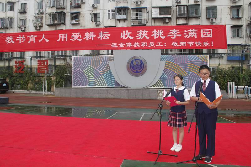 操场上,艳丽的红毯、高悬的横幅、雨后清新的空气、老师们灿烂质朴的笑容、学生们由衷热烈的掌声,活动现场一派喜气洋洋、愉悦温馨的景象。本次活动由初二(2)班的曹宇涵与王青云担任主持人,两位主持人以诗朗诵《无上的荣光》开场,以此向我校全体教师深情告白,营造出了暖心的现场气氛。