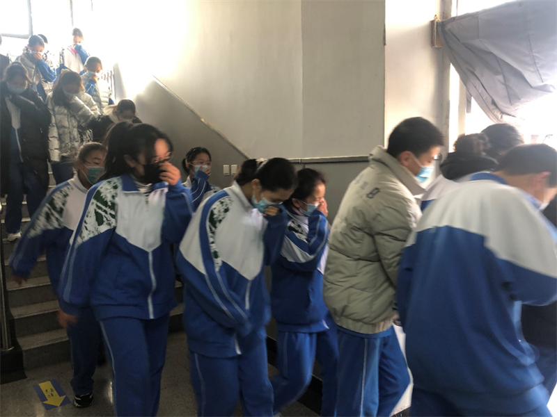 此次演练活动,学校安全管理部门和学生发展中心高度重视。本着“安全第一,预防为主”的思想,结合学校实际,学校认真细致地制定了此次演练活动方案,并向全体师生展开动员,明确所有教师的岗位和职责要求。上午9点30分,随着警报的响起,各位老师立即到达指定岗位,各班班主任带领学生根据演练方案中规定的路线,弯着腰,用手捂住口鼻,沿着学校指定安全出口快速疏散,有序撤离到学校操场的安全地带。全校六百余师生,全部疏散到操场共用时1分09秒。教室位于四层的初三年级有一名同学腿脚不方便,学校安排了体育徐浩老师和班里的两名同学,专门护送她疏散到安全地带,整个过程紧张有序,达到了预期的效果。