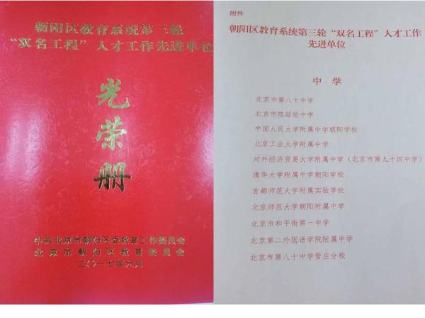 2016年6月15日,在朝阳区教育系统党建工作暨第四轮“双名工程” 工作部署会上,学校被评为朝阳区第三轮“双名工程”人才工作先进单位。学校全面贯彻落实“人才强教”战略部署,围绕培养“四有好教师”、当好“四个引路人”大力开展人才队伍建设,推进学校“双名工程”落实落细,涌现出一大批在人才工作取得突出成绩的先进个人和团队。学校有特级教师10人,北京市骨干教师2人,朝阳区学科带头人3人,朝阳区骨干教师27人,朝阳区优秀青年教师12人。今后,学校将总结经验、发扬成绩,为开创朝阳区教育事业新局面贡献力量。