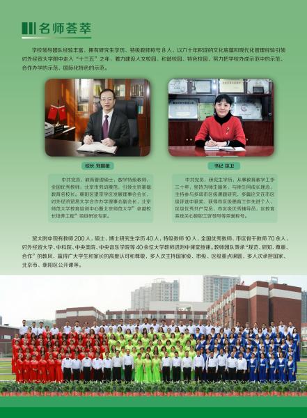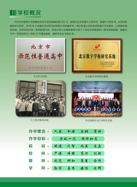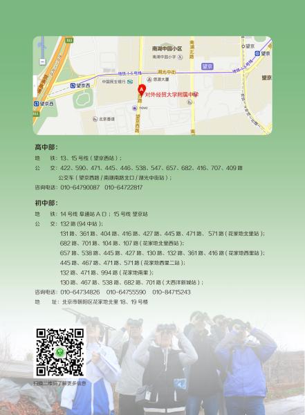 高中部地址:北京市朝阳区南湖中园315号 咨询电话 校办:64790087 招生办:64729318 德育处:64723757 教学处:64725913