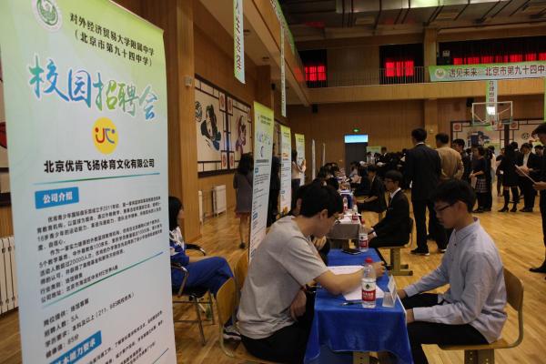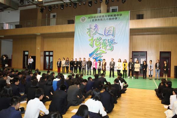2017年4月18日,对外经济贸易大学附属中学高一年级”遇见未来的自己”校园模拟招聘会圆满落幕。校园招聘会采用社会招聘的形式,旨在为学生提供一个近距离接触行业精英的平台,使同学全方位地了解招聘的相关知识、技巧,并提供一个实际展现自我的舞台。招聘会的面试官是来自可口可乐、万科、华夏银行等20个不同领域不同公司的专业HR。参加活动的292名高一学生,有260多名学生顺利通过面试,被各大名企“录用”。此外,学校还邀请部分家长前来观摩。