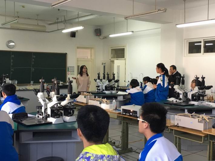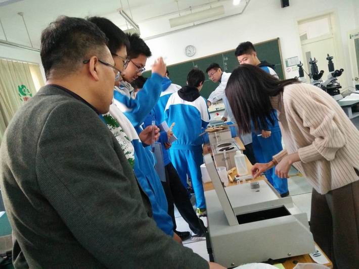 2017年12月6日对外经济贸易大学附属中学高中部,生物组青年教师杨彩云老师在生物实验室S209进行了活力课堂研讨课,带领学生探究酶的特性。