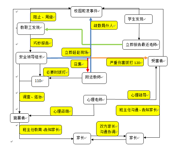 2、组长接到通知后,迅速赶赴现场,控制局面,情况危急且不受控制的情况下拨打“110”,与此同时,一面迅速召集最近的教师(最好是男教师)赶赴现场,阻止欺凌者施暴,一面通知现场安全组组长前往现场。