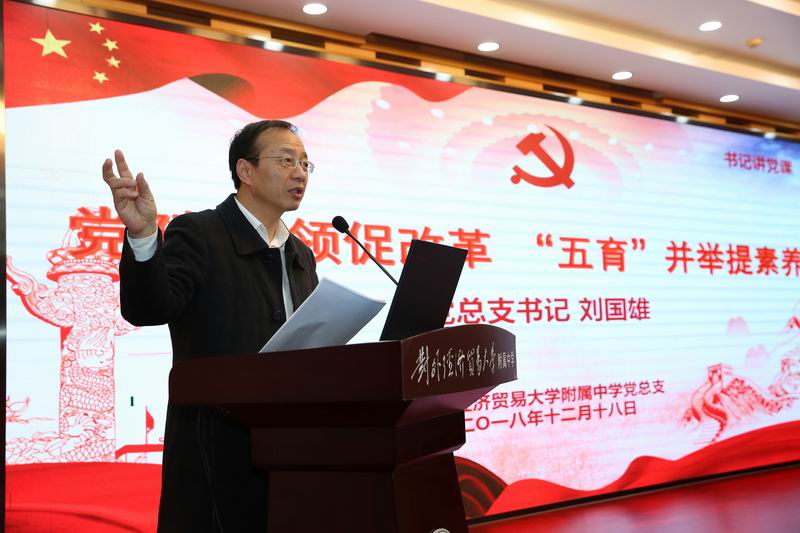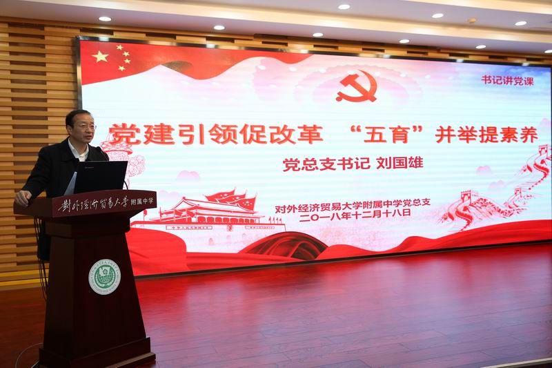 2018年12月18日,贸大附中党总支书记刘国雄以“党建引领促改革 五育并举提素养”为题讲授专题党课,学校全体党员、教职工参加党课学习。刘国雄书记提出,全体党员、教职工要将十九大精神转化为优先发展教育事业的生动实践,牢牢守住思想政治这一生命线,落实立德树人根本任务,培养德智体美劳全面发展的社会主义建设者和接班人。贸大附中党组织一直以来积极探索党组织建设与学校中心工作的协同创新机制,服务教育教学中心,引领学校改革发展。