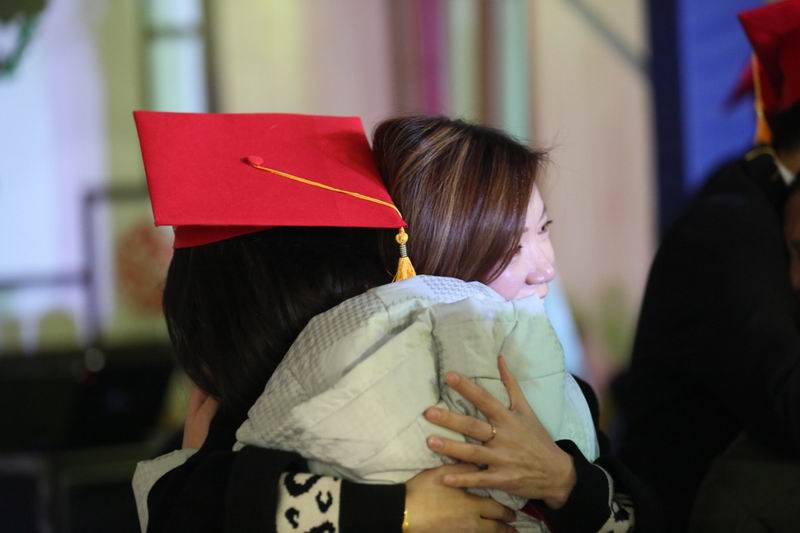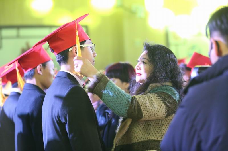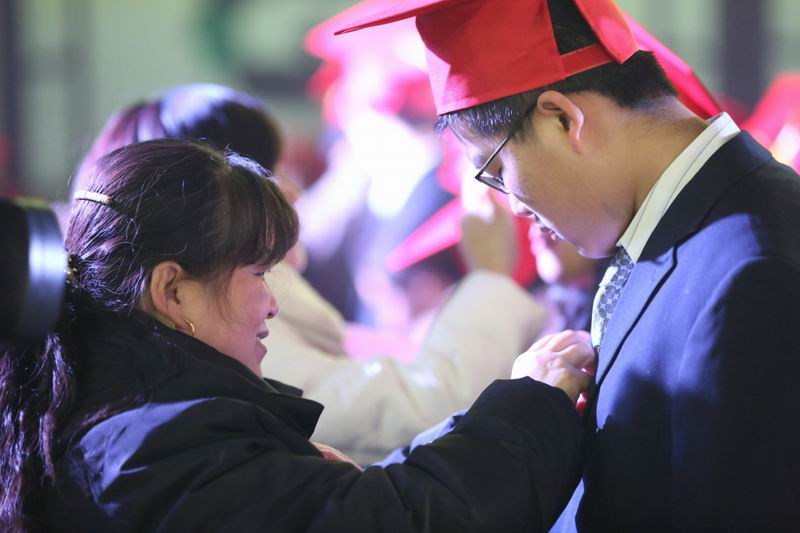 家长为学生整理成人帽,佩戴成人徽章,交换书信,相互拥抱。