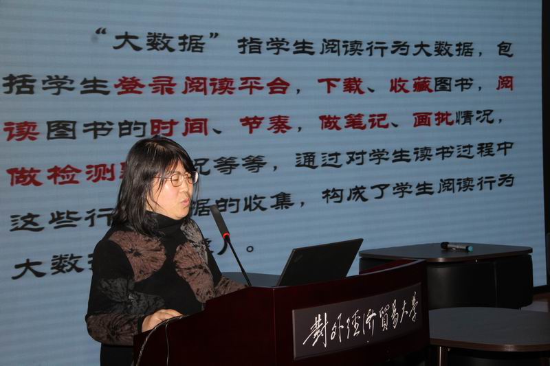 首先贸大附中语文特级教师李燕就“大数据精准服务语文阅读教学——数字化阅读‘校本课程’研究”给现场的老师带来了一场别开生面的报告。李燕老师从学校整体阅读数据、初一年级阅读数据、班级个人阅读数据三个方面阐述了数字阅读能给教师们提供真实的、具体的、动态的学生阅读进度与效果。基于对学生阅读行为大数据分析的前提下,李老师又从阅读书目的确定、阅读兴趣的培养、阅读任务的设计、阅读策略的研究、阅读能力的测评、阅读成果的展示等六个维度进行了解读。