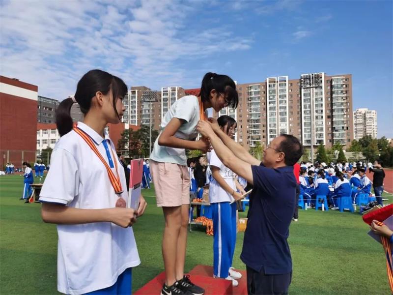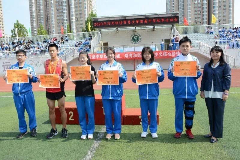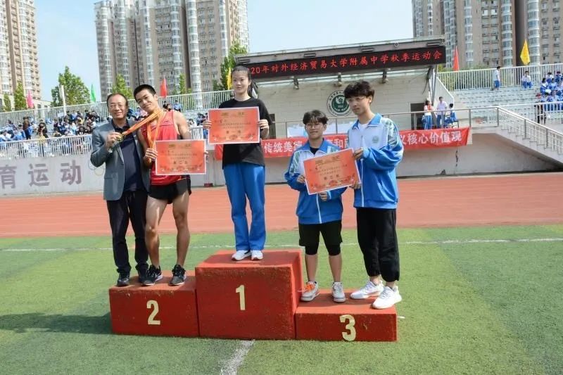 运动会的最后,校领导们一起为获奖团队及个人颁奖,为每一位贸大附中学子们喝彩,激励同学们奋发向上、不懈拼搏,在强健体魄的同时塑造坚毅正直的品格,不断发掘潜能、自主成长,为实现祖国的宏伟蓝图贡献自己的力量!