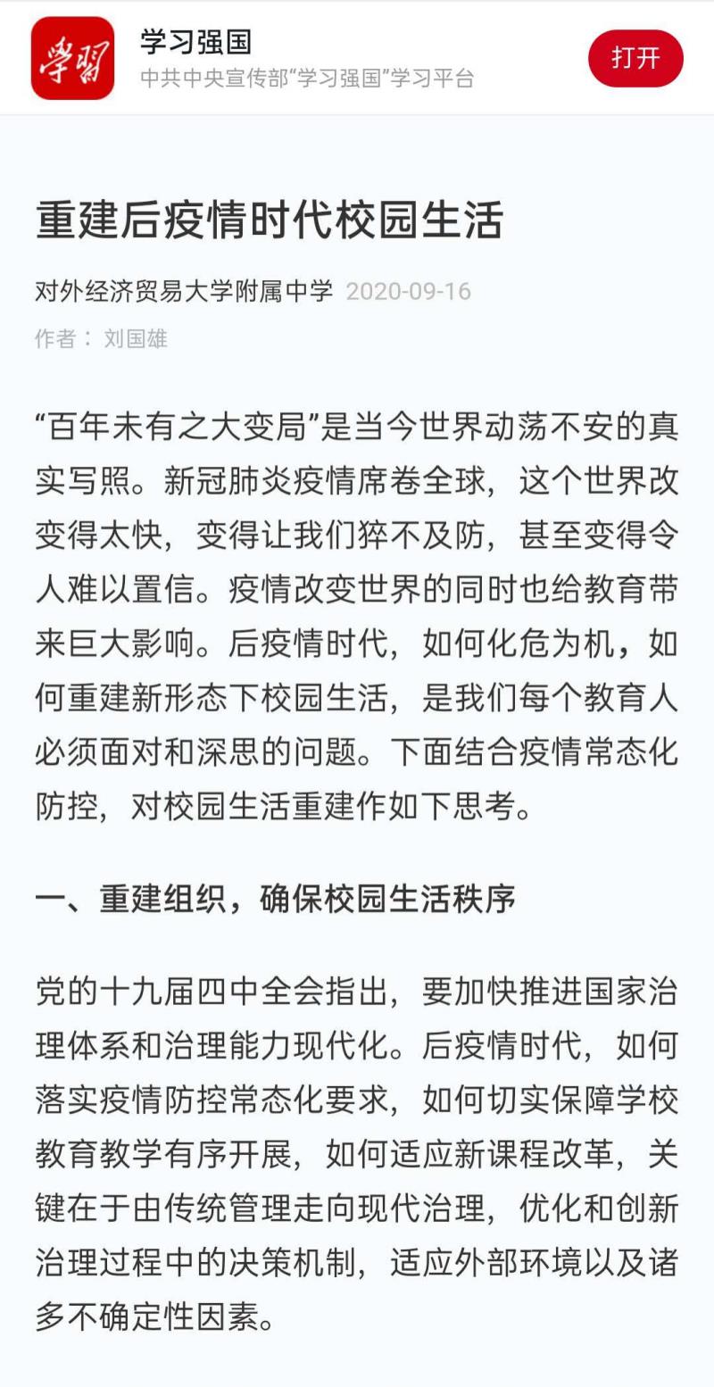 在疫情防控常态化背景下,新学期学校如何重建新形态下校园生活,加速推进学校治理现代化,为“后疫情时代”学校发展赋能。北京市特级校长、特级教师刘国雄在“学习强国”平台上发表的《重建后疫情时代校园生活》一文中,从“重建组织”、“重建关系”、“重建课程”、“重建新常态”、“重建资源”、“重建制度”六个维度,为后疫情时代重建校园生活支招。