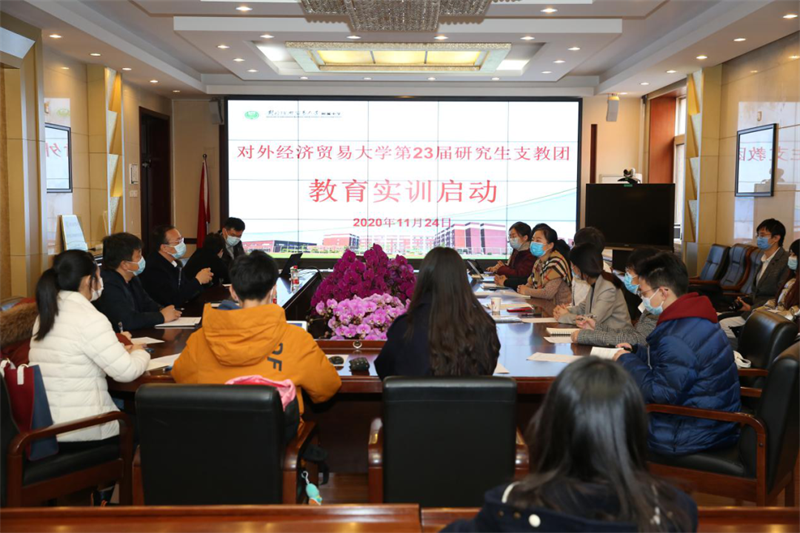 2020年11月24日,贸大基础教育协作办公室主任王丽娟、团委办公室主任陈玲、团委李岳桐组织对外经济贸易大学第23届研支团成员21人来到附中高中部开启教育实训。贸大研究生张亚楠献上一节精彩的语文课。