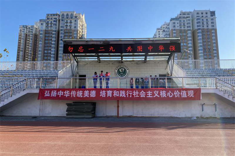 八十五年后,一二•九向上的斗志经久不息,我们贸大附中学子共同缅怀历史,唱响未来。随着雄壮的国歌声,以“勿忘一二九,共图中华强”为主题升旗仪式正式开始。升旗仪式上,领导、老师、学生庄严肃穆,高一6班同学的演讲和朗诵为我们描绘着那一段重要的历史时刻,让我们铭记着落后就要挨打的血的教训。爱国是我们每一个中国人都肩负的责任,激励自己,警醒后人,是我们该有的行动,用行动爱国,努力学习,认真做人,心系国魂。