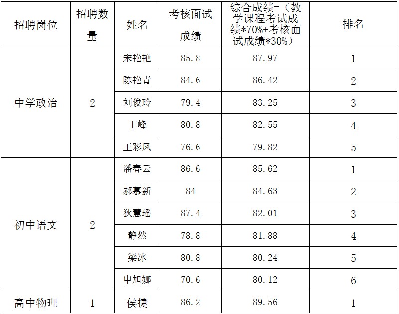 公开招聘2021年毕业生入围人员考核面试成绩公示