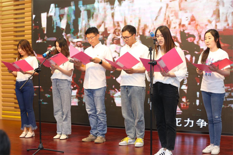 “让党旗引导我们前进,让党的光辉哺育我们成长……”我校党总支书记徐卫、党总支副书记石淳、副校长李怀东、初中部主管副校长宋妍妍、校长助理石化功、蒋建华、陈爱民、王振兴,共同深情朗读诗歌《五四礼赞》,以诗传意,寄语青年教师要紧跟党的步伐,立大志、明大德、成大才、担大任。