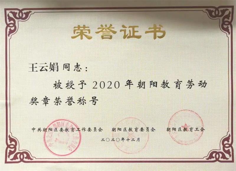 在第72个国际劳动节来临前夕,初中部理化生组和高中部王云娟老师分别荣获“2020年朝阳教育先锋号”和“朝阳教育劳动奖章”称号。