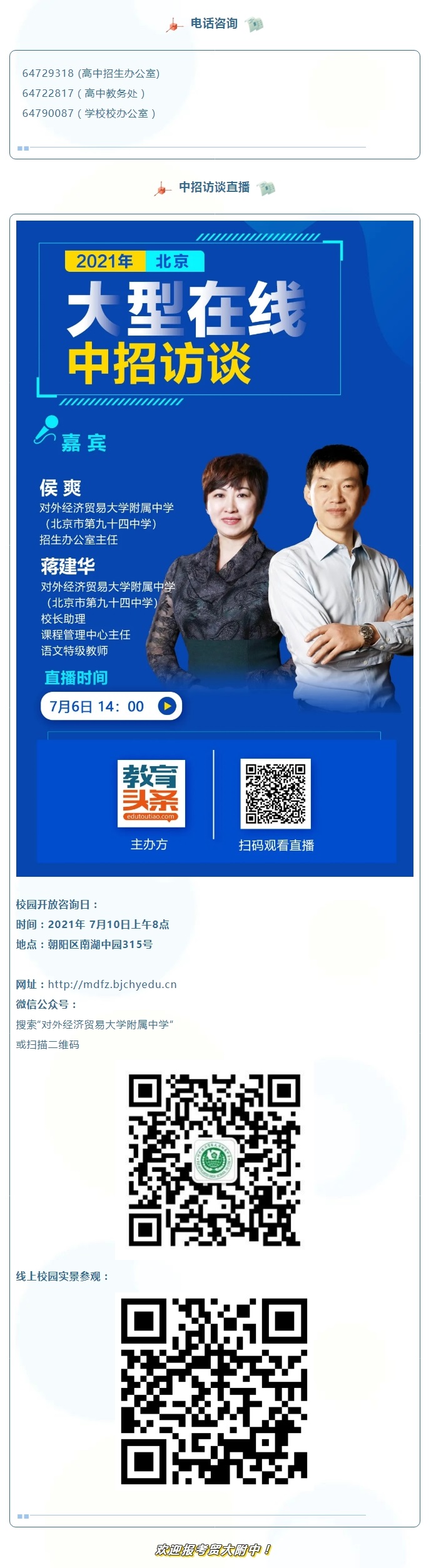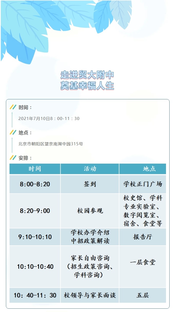 中招校园开放日,7月10日我们在贸大附中等您!
