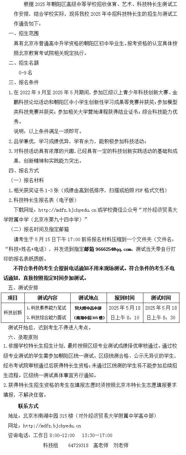 高中部地址:北京市朝阳区南湖中园315号 咨询电话 校办:64790087 招生办:64729318 德育处:64723757 教学处:64725913