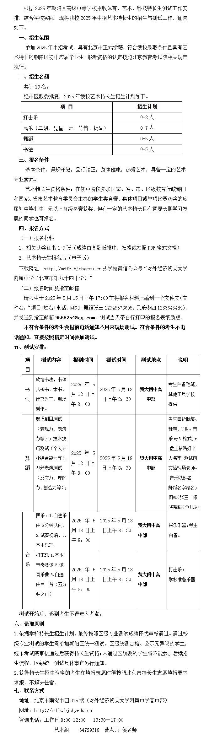 2025年中招艺术特长生招生通告